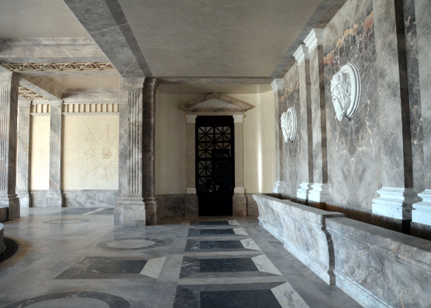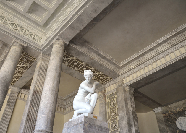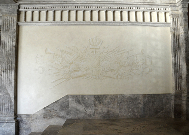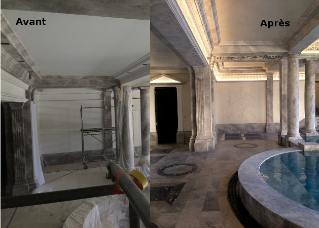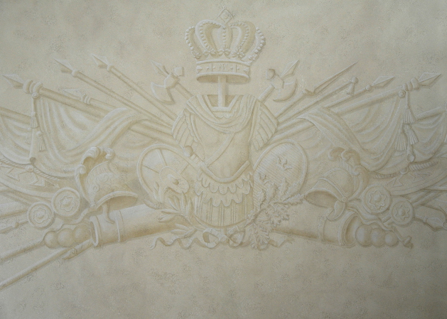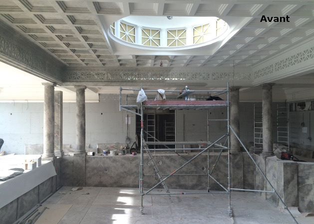 Réalisation de décors peints variés : 400m2 de plafonds en faux marbre, palmettes et trophées en grisaille, imitation bronze, dorure à la feuille...