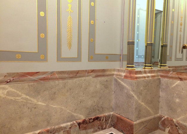 Décor faux marbre et dorure à la feuille d'or dans l'espace lave-main