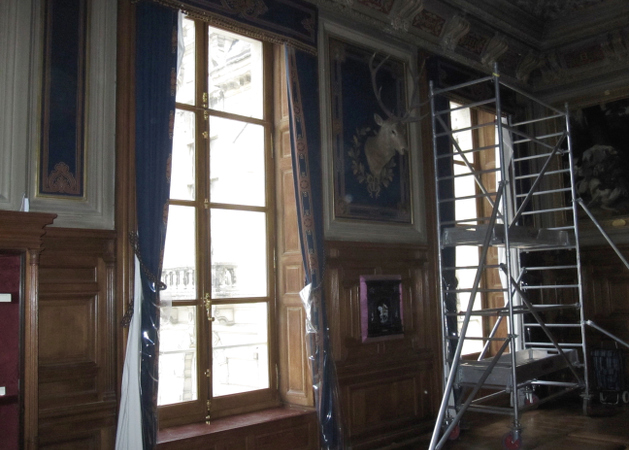 Réalisation de décors peints dans diverses pièce d'un château (imitation chêne, frises, écoinçons, grisailles, faux marbre et fausse pierre..).