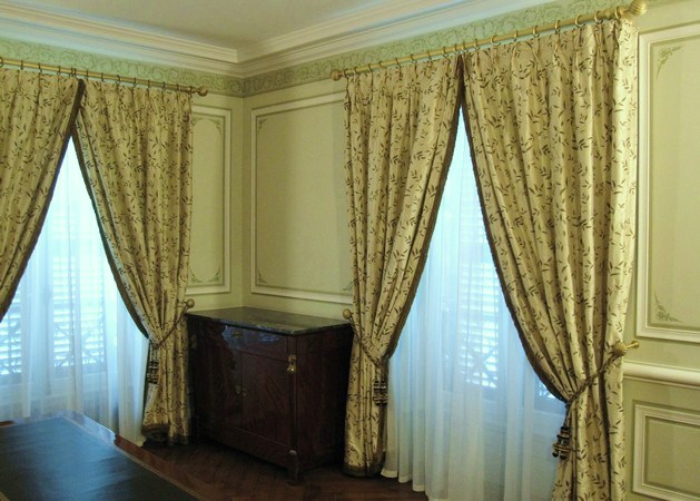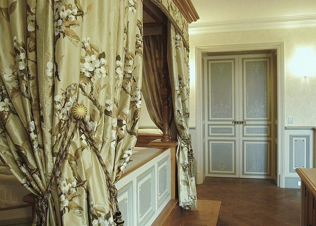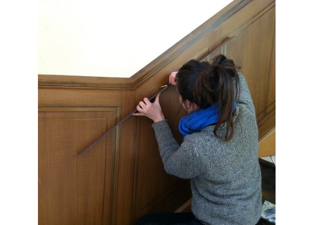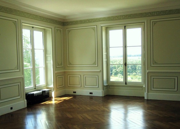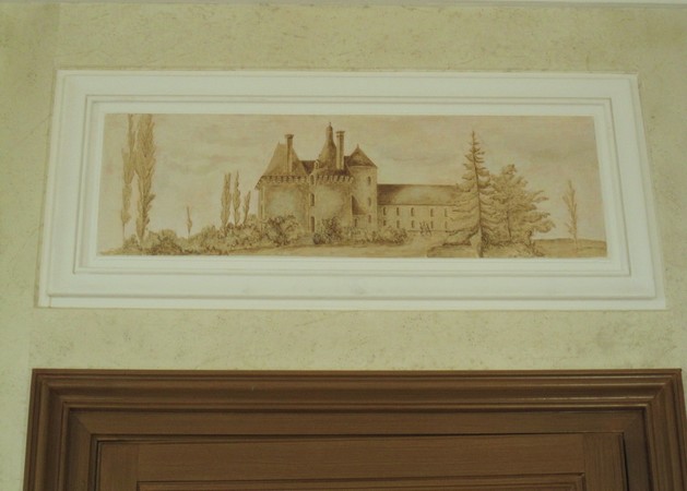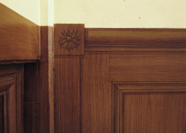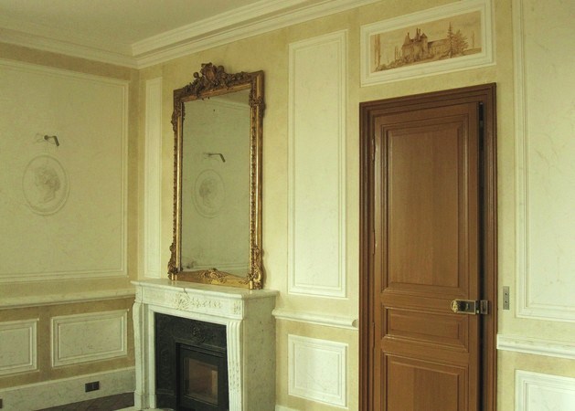 Réalisation de décors peints dans diverses pièce d'un château (imitation chêne, frises, écoinçons, grisailles, faux marbre et fausse pierre..).