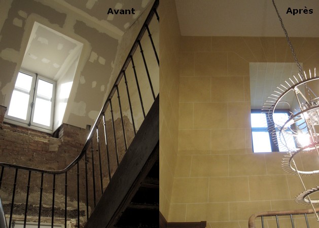 Imitation pierre de France dans une entrée et faux marbre sur plinthes