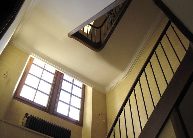Marqueterie de marbre sur le soubassement d’une cage d’escalier. Maison particulière. Moulures, plinthe et main courante en trompe l’œil.