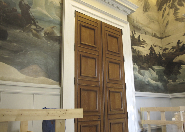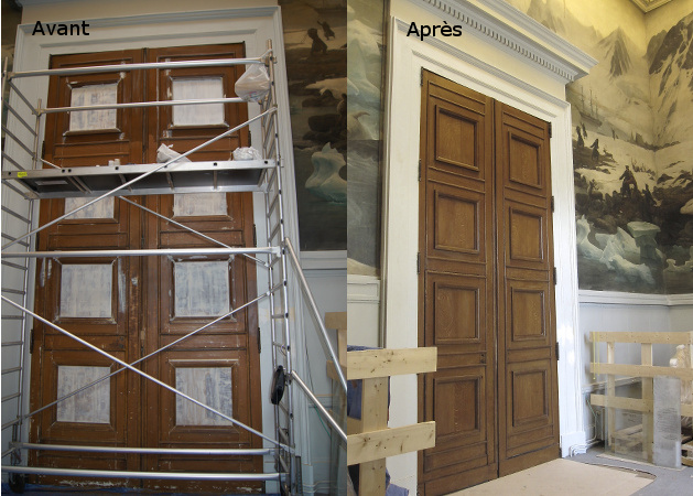 Réfection du décor faux chêne sur les panneaux des portes de la galerie de minéralogie du musée.